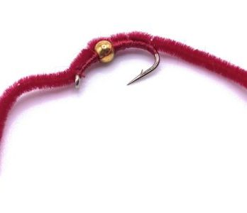 The San Juan Worm fly typically consists of a hook, a bead, thread, and a piece of chenille or yarn that is wound around the hook shank to create a worm-like body.